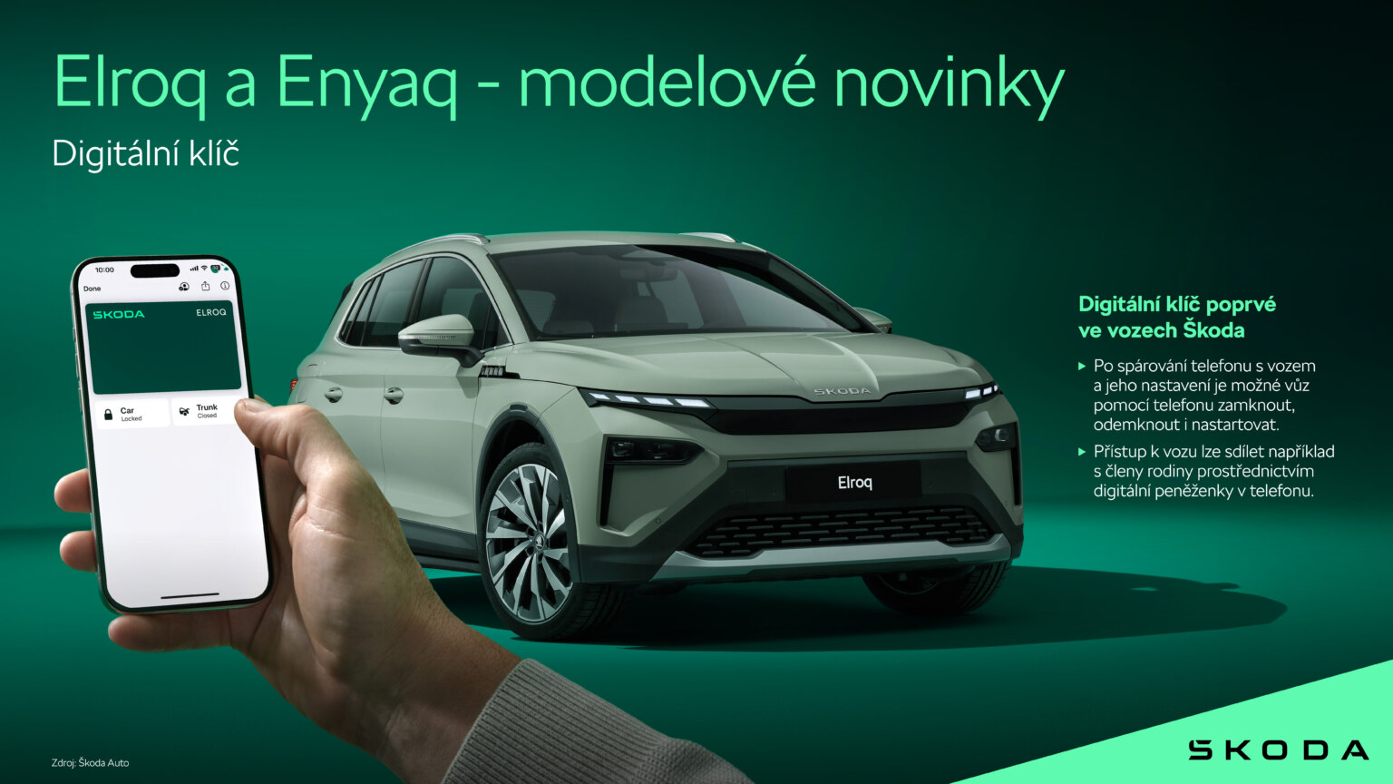Vozy Škoda budou poprvé vybaveny funkcí digitálního klíče2. Po spárování telefonu s vozem a jeho nastavení mohou uživatelé vůz pomocí chytrého telefonu zamknout, odemknout i nastartovat. Jakmile je digitální klíč aktivován v aplikaci MyŠkoda, lze přístup k vozu sdílet například s členy rodiny prostřednictvím digitální peněženky v telefonu.